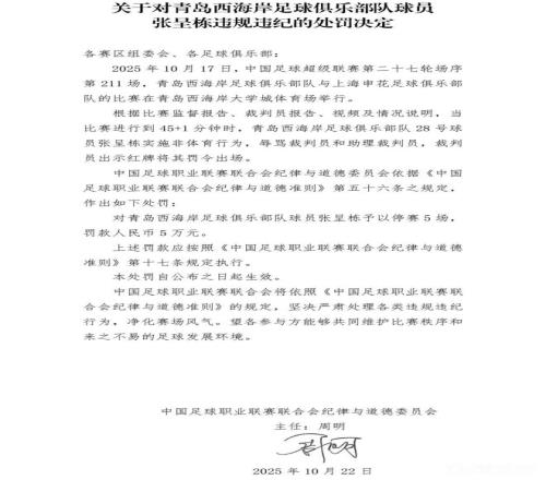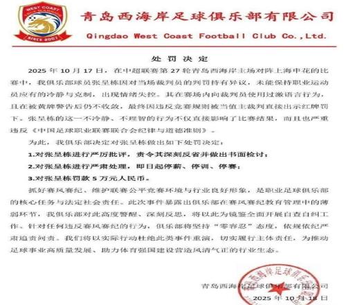 10月22日下午,中足联官方发布一则处罚公告,青岛西海岸球员张呈栋因辱骂裁判被禁赛5场并罚款5万元。在中超仅剩三轮的情况下,此番被禁赛,意味着张呈栋已经提前结束了本赛季联赛,值得一提的是,张呈栋与青岛西海岸俱乐部的合同今年年底到期。俱乐部不可能再和他续约了。