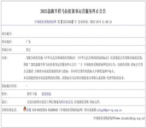 直接原因是,据马拉松圈内人士分析,10月9日的时候,中国政府采购网发布了一则《2025翁源半程马拉松赛事运营服务终止公告》通知,提及了“新规”:“由于马拉松政策新规,县区级及以下的C类马拉松赛事将全面停办,故终止本项目当前招标采购活动。”