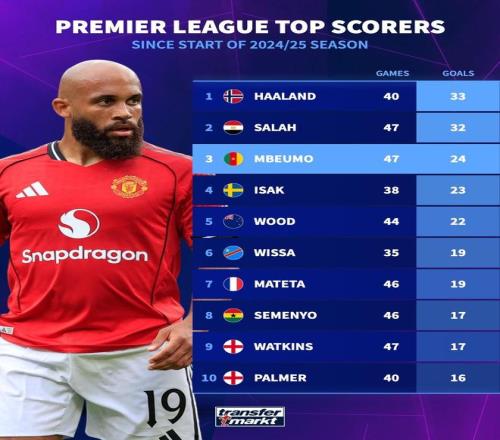 上赛季至今英超进球数前10:哈兰德、萨拉赫前2,姆伯莫第3
