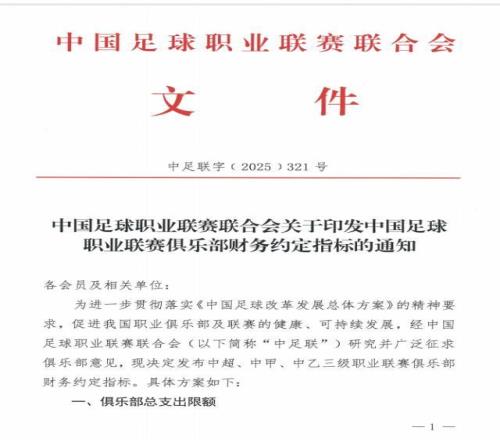 12月3日,中国足球职业联赛联合会发布了《中国足球职业联赛联合会关于印发中国足球职业联赛俱乐部财务约定指标的通知》,该文件是2021年中国足协发布的《关于发布2021-2023赛季中超联赛俱乐部财务约定指标的通知、关于发布2021-2023赛季中甲联赛俱乐部财务约定指标的通知、关于发布2021-2023赛季中乙联赛俱乐部财务约定指标的通知》的替代性规定。