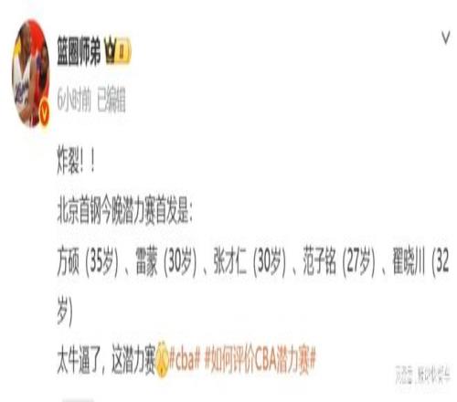 CBA新赛季才刚开打两天,CBA联赛便曝出了最荒唐一幕。作为CBA新赛季增设,为了培养新人的潜力赛,竟然直接沦为老年赛了。在北京队以84-74击败江苏队以后,随后的潜力赛,北京队派出了死亡五老,翟晓川、方硕、范子铭、张才仁以及雷蒙领衔出战,要知道,这5人可是北京队的老将,他们的平均年龄已经达到30.8岁。不知道CBA这潜力赛,究竟是培养新人呢,还是锻炼老将?