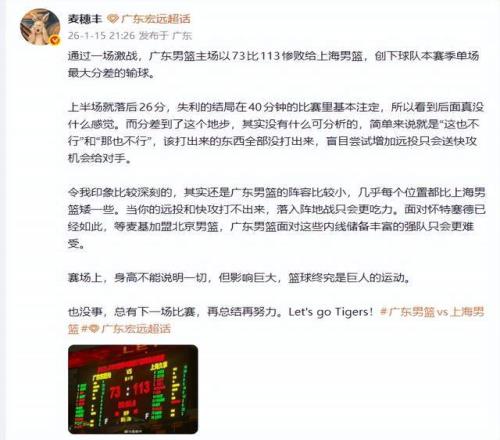 显然,在麦穗丰看来,广东队输在2点,那就是这也不行,那也不行,咋打都不行。随后麦穗丰老师又表示,“令我印象比较深刻的,其实还是广东男篮的阵容比较小,几乎每个位置都比上海男篮矮一些。当你的远投和快攻打不出来,落入阵地战只会更吃力。面对怀特塞德已经如此,等麦基加盟北京男篮,广东男篮面对这些内线储备丰富的强队只会更难受。赛场上,身高不能说明一切,但影响巨大,篮球终究是巨人的运动。”